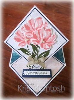 I cut out the flowers using the co-ordinating Floral Gallery Die. I attached the flower stems and flowers to the front panel of the card using dimensionals under the last flower. I added three large Basic Pearls to the centre of each flower. Lastly I tied a bow in a length of Fine Art Ribbon and attached it over the flower stems using a Glue Dot. To create the mechanism to hold the card upright, I stamped “congratulations” from the Art Gallery stamp set onto Basic White card using Mossy Meadow ink.