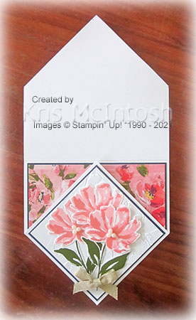 Yesterday on my Facebook Live I demonstrated how to create this kind of card. I watched a video by Teri Pocock which I found on Pinterest which showed how to create this style of card. Teri created a box for her card but not a pizza style box. Since the card in 6″ square, I also shared how to create a pizza box to gift the card. I created the card base from Basic White card. I attached pieces of the Floral Gallery Designer Series Paper to Night of Navy card and then the card base.