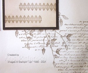 I stamped the leaf image from the same stamp set over the writing in the top left and lower right hand corners using Crumb Cake ink. I stamped the straight edge image from the Very Versailles stamp set onto the top right and bottom left hand corners using Crumb Cake ink. I used a Blending Brush to add Crumb Cake ink to all four sides of the page. I attached the photos straight onto the Very Vanilla page. I created the journaling on my computer and printed onto Very Vanilla card. I stamped the straight edge from the Very Versailles stamp set twice below the journalling using Crumb Cake ink. I used a Blending Brush to add Crumb Cake ink around the edges of the journaling panel before attaching it to Early Espresso card and then the page. I cut the title from Early Espresso card using the Playful Alphabet Dies.