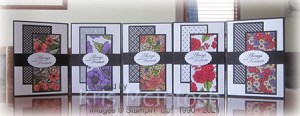 I attached each piece of Designer Series Paper to Basic Black card and then Basic White card which I embossed using the Tasteful Textile 3D Embossing Folder. I attached a strip of Basic Black card across the centre of the card front before attaching to scored and folded Basic Black card. I stamped the greeting from the Forever Blossoms stamp set onto Basic White card using Memento Tuxedo Black ink and punched out the greeting using the Double Oval Punch. I attached the greetings to the card front using dimensionals. To decorate the inside of the card, I attached a narrow strip of Basic Black card behind one long edge of a narrow strip of True Love Designer Series Paper. The Designer Series Paper panel was attached across the bottom of Basic White card. I created five different versions of this card using five different patterns from the True Love Designer Series Paper.