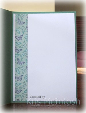 I cut out the greetings using one of the circles from the Stitched Shapes Dies (unfortunately sold out). The greeting is attached to a Silver Foil scalloped circle which was cut using the Layering Circles Dies. I attached the greeting to the card front using dimensionals. I stamped the butterfly from the Butterfly Brilliance stamp set onto Basic White card using Just Jade ink. I cut out the butterfly using the Brilliant Wings Dies. I curled the wings of the butterfly and attached it to the greeting panel using dimensionals under the wings and glue dots under the body. I cut the co-ordinating detailed butterfly from Silver Foil card using the Brilliant Wings Dies and curled the wings slightly upwards. I attached the Silver Foil butterfly to the stamped butterfly using Tombow Multipurpose Glue under the body and antennae only. To decorate the inside of the card, I attached a narrow strip of the same pattern Butterfly Bijou Designer Series Paper down the left hand side of Basic White card.