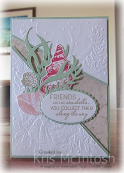 I cut Mint Macaron card and Basic White card using the Seaside Seashells Die. I stamped the seashell images onto the Basic White die cut using Blushing Bride, Melon Mambo and Sahara Sand ink. I trimmed the seashells from the die cut and attached them to the Mint Macaron die cut.