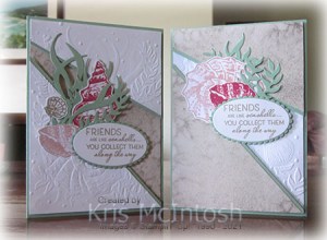 I cut the Mint Macaron die cut into pieces and attached several of them to the card front, using dimensionals where the pieces sit over the recessed panel. I stamped the greeting from the Friends are Like Seashells stamp set onto Basic White card using Sahara Sand ink. I cut out the greeting using the Layering Ovals Dies and attached it to a Mint Macaron scalloped oval cut using the same dies. The image panel is attached to the card front using dimensionals where necessary. To decorate the inside of the card, I stamped a seashell from the Friends are Like Seashells stamp set using a co-ordinating ink colour. The second card uses the remaining die cut pieces for the card front decoration.