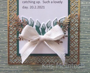 I attached the journaling to Shaded Spruce card and then one of the card fronts from the Forever Gold Laser Cut Specialty Designer Series Paper. To decorate the journaling panels, I stamped the smallest images from the Forever Fern stamp set twice each onto Basic White card using Shaded Spruce ink and cut them out using the co-ordinating Forever Flourishing Die. I attached two leaves to each of the journaling panels. I cut Shaded Spruce card twice using the half circle leaf die from the Forever Flourishing Dies and attached one to each journaling panel. I added a gold foil leaf over the top from the Forever Gold Laser Cut Specialty Designer Series Paper. Lastly I added a bow tied using the Vanilla Open Weave 1/2″ Ribbon from the Forever Greenery Trim Combo Pack.