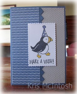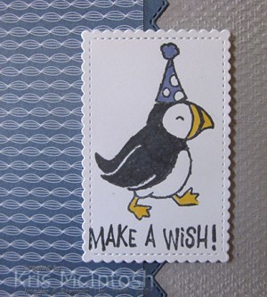 I cut Basic White card using one of the Stitched So Sweetly Dies. I stamped the puffin image from the Party Puffins stamp set onto the die cut using Memento Tuxedo Black ink. I stamped “make a wish” from the same stamp set below the puffin image also using Memento Tuxedo Black ink.
