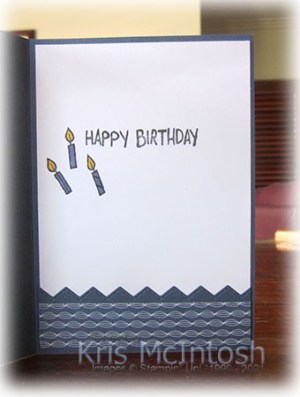 I coloured the beak and the feet of the party puffin using the Dark Daffodil Delight Stampin’ Blend. I coloured the hat using the Light Misty Moonlight Stampin’ Blend before attaching the image panel to the card front using dimensionals. To decorate the inside of the card, I stamped “happy birthday” from the Party Puffin stamp set onto Basic White card using Memento Tuxedo Black ink. I stamped the candle image from the Party Puffin stamp set next to the greeting also using Memento Tuxedo Black ink. I coloured the candles using the Dark Daffodil Delight and Light Misty Moonlight Stampin’ Blends. I attached the other half of the border cut from Misty Moonlight card using the Basic Borders Dies behind one long edge of a piece of the same pattern Dandy Garden Designer Series Paper. The designer series paper panel is attached across the bottom of the stamped Basic White card.