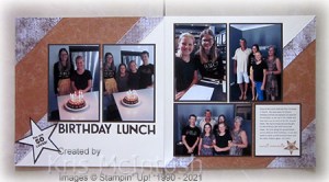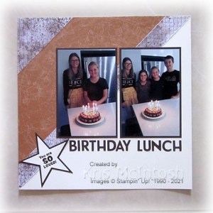 Today’s page shows off some photos taken on the day we took Elyssa and Ava out to celebrate their birthdays. They both celebrate in March, Ava turned 11 and Elyssa turned 13. I can’t believe how quickly they are growing up. I found a sketch layout I liked and decided to use the World of Good Specialty Designer Series Paper (now retired). I cut two different patterns of paper in half on the diagonal, cutting a narrow strip and the corner piece from one pattern and the large central pieces from another pattern.