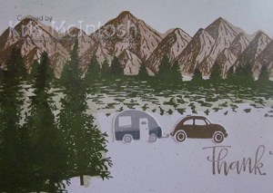 I stamped the detailed image over the top using Mossy Meadow ink. I stamped “thank you” from the Peaceful Moments stamp set onto the lower right hand corner using Soft Suede ink. I stamped the caravan image from the long retired Let’s Get Away stamp set onto Basic White card using Smoky Slate ink. I added a strip of darker colour using the Light Basic Black Stampin’ Blend.
