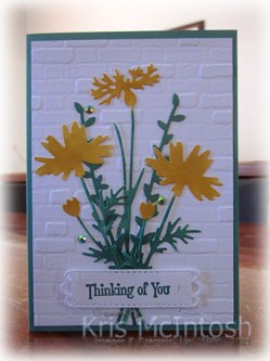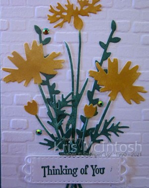 I used a sponge daubers to add Bumblebee ink to the flowers and Just Jade ink to the stems and leaves. It’s surprising just how much colour you get when you do this. I attached the leaf die cuts to the card front and then the single flower die with the two remaining flower dies on top, trimming away any of the stems where they extended beyond the embossed layer.