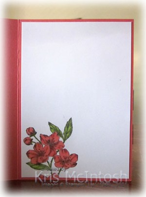I cut out the flower using the co-ordinating Cherry Blossoms Die and attached it to the card front so that it followed the curved line of the die cut. I stamped the greeting from the Forever Blossoms stamp set onto Basic White card using Calypso Coral ink. I punched out the greeting using the Double Oval Punch. I attached the greeting to a Calypso Coral oval punched using the Double Oval Punch and then to card front. I coloured a length of Basic White Baker’s Twine from the Baker’s Twine Essentials Pack using the Dark Calypso Coral Stampin’ Blend and tied a bow which I attached to the flower stem. To decorate the inside of the card, I stamped a portion of the large floral image from the Forever Blossoms stamp set onto the lower left hand corner of Basic White card using Memento Tuxedo Black ink. The image is coloured using the Calypso Coral and Granny Apple Green Stampin’ Blends.