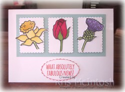 Today I am sharing with you the first card that I made using this fabulous resource. I printed the page with the four small floral images and lots of greetings onto Basic White card. I coloured the flowers using Granny Apple Green, Highland Heather, Light Daffodil Delight and Dark Real Red Stampin’ Blends. Once I coloured the images I cut them out. I punched Basic White card using the Postage Stamp Punch and attached the punched pieces to Pool Party card using dimensionals.