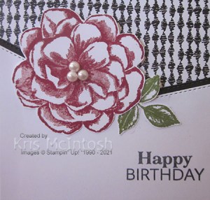 I couldn’t help creating another card using the stamp set from the Sentimental Rose Card Kit. I combined it with my current favourite Pattern Party Designer Series Paper. I attached a piece of the Pattern Party Designer Series Paper to the top section of Basic White card. I used the Basic Border Dies to cut Basic White card and Basic Black card. I attached the Basic Black card behind the Basic White card. The whole panel is attached to the Basic White card partially covering the Designer Series Paper. I stamped the greeting from the Sentimental Rose stamp set onto the Basic White card using Memento Tuxedo Black ink.