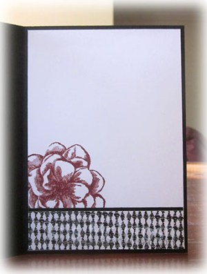 I attached the leaves to the back of the Rose before attaching the whole piece to the card front using dimensionals where necessary. To decorate the inside of the card I stamped the rose from the Sentimental Rose stamp set onto the lower left hand corner of Basic White card using Cherry Cobbler ink. I attached a narrow piece of Basic Black card behind one long edge of a strip of the same Pattern Party Designer Series Paper I used on the front of the card. The designer series paper panel is attached to the bottom of the stamped Basic White card, partially covering the flower.