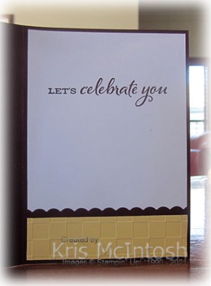 To decorate the inside of the card, I stamped the greeting from the Celebrate Sunflowers stamp set onto Basic White card using Blackberry Bliss ink. I cut a narrow strip of Blackberry Bliss using the same Scalloped Contour Die that I used on the front of the card to create a narrow border strip. I embossed a piece of So Saffron card using the Checks & Dots Embossing Folder and attached the Blackberry Bliss border behind one long edge. The embossed panel is attached to the bottom of the stamped Basic White card.