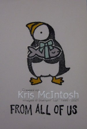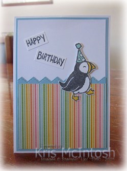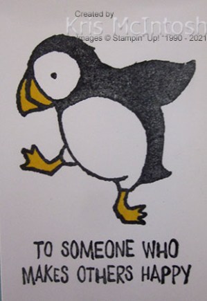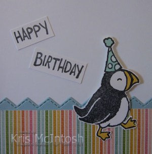 I cut out the puffin and attached him to the card front using dimensionals where necessary. I stamped “happy birthday” from the Party Puffins stamp set onto Basic White card using Memento Tuxedo Black ink.