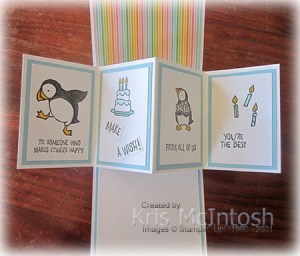 I attached Pool Party to each of the sections of the Pop and Twist. All of the images I used to decorate the four panels come from the Party Puffins stamp set. I stamped all of the images onto Basic White panels using Memento Tuxedo Black ink.