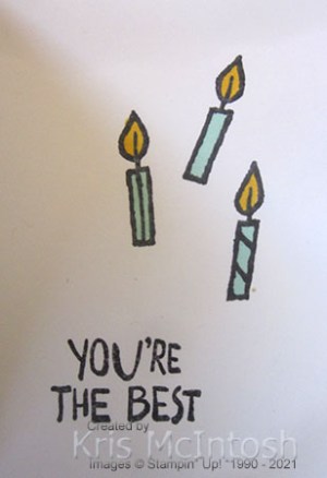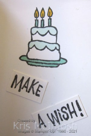 I used Pool Party, Light Smoky Slate and Dark Daffodil Delight Stampin’ Blends to colour the images. I stamped “make a wish” onto Basic White card using Memento Tuxedo Black ink and used my Paper Trimmer to cut up the greeting before attaching it to the second panel.