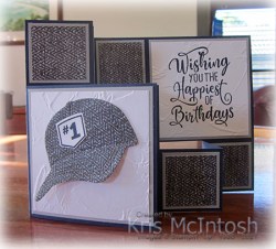 I stamped the greeting from the Happiest of Birthday’s stamp set onto Basic White card using Night of Navy ink before embossing the panel with the Painted Texture 3D Embossing Folder. This panel is attached to the large space on the right hand corner of the card. I embossed another piece of Basic White card using the Painted Texture 3D Embossing Folder to attach to the front of the small folded card. I cut the large hat from the same pattern In Good Taste Designer Series Paper using the Hat Builder Dies and attached it to the card front. I did not add adhesive under the brim of the cap to give it a little more dimension. I stamped “#1” from the Hats off stamp set onto Basic White card using Night of Navy ink.