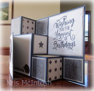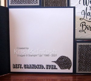 Today I thought I would share with you the card I made for my eldest grandson’s 15th birthday. I used the template that Julie Burt shared on a demonstrator only facebook page quite a while ago. If you go to this post you can download a PDF to get the basic instructions for creating the card. I began by cutting Night of Navy card to create the base card and the small folded card on the front. I cut pieces of Smoky Slate card and attached them to the card base. I used one of the patterns from the In Good Taste Designer Series Paper to attached to all of the small squares except the one in the middle of the card. For this panel I embossed Basic White card using the Painted Texture 3D Embossing Folder.