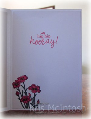 I cut out the greeting using the label die from the Meadow Dies, added some Crumb Cake ink using the Blending Brush before attaching it to the card front using dimensionals. I coloured five medium Basic Pearls using the dark Polished Pink Stampin’ Blend and added them to the flower centres as well as one to the greeting label. To decorate the inside of the card, I used the calendar image from the Days to Remember stamp set to add a “4” and then an “0” to Basic White card using the Polished Pink Stampin’ Write Marker. I stamped the greeting from the Best Year stamp set below the “40” using Polished Pink ink. I stamped part of the floral image from the Quiet Meadow stamp set onto the lower left hand corner of the card using Memento Tuxedo Black ink. I coloured the image using the Dark Polished Pink and Dark Soft Succulent Stampin’ Blends.