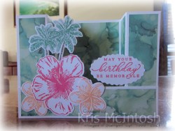 I cut out all of the images using the co-ordinating In The Tropics Die. I attached the palm trees to the card first and then layered on the hibiscus and two frangipani flowers. I stamped the greeting from the Timeless Tropical stamp set onto Basic White card using Polished Pink ink and punched it out using the Double Oval Punch. The greeting is attached to the right hand side of the card so that the left portion floats. I attached the last frangipani to Basic White card which I attached to the back of the card to give me somewhere to write a message. Since this card folds flat, it will fit into a standard envelope.