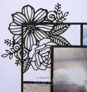 The Basic Black panel is attached to a Basic White 12″ x 12″ page. I attached Adhesive sheet to the back of a piece of Basic Black card. I used this piece of Basic Black to cut using the beautiful floral die from the Artistic Dies which I attached over the embossed Basic White card. The photo is attached to Basic Black card and then the page, partially covering the die cut.