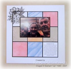 Today’s page shows off a selphie taken when we attend Grandparents Day at Jae’s school. It’s not a great photo of Ron and I but it was the only one we got on the day so I will live with it because it reminds me of the special time we spent with Jae. I attached 3″ squares of Sea and Sand Designer Series Paper (which is no longer available) to Basic Black card. I also attached one square of Basic White which I embossed using the Macrame 3D Embossing Folder. The last panel contains my journaling which I printed onto Basic White card.