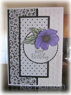 I needed to make a card for a friend recently and found these cards on Pinterest by Carolyn King and couldn’t resist creating a similar card. I embossed Basic White card using the dotted folder from Checks & Dots Embossing Folders. I attached a piece of True Love Designer Series paper to Basic Black card and then the left hand side of the embossed Basic White card. I attached the panel to scored and folded thick Basic White card. I attached another pattern from the True Love Designer Series Paper to Basic Black card and then the card front.