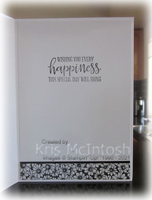 I coloured one of the flowers from the True Love Designer Series Paper using Highland Heather, Dark Daffodil Delight and Soft Sea Foam Stampin’ Blends. I cut out the flower and attached the flower to the greeting panel. To decorate the inside of the card, I stamped another greeting from the Peaceful Moments stamp set onto Basic White card using Memento Tuxedo Black ink. I attached a strip of Basic Black card behind one long edge of a piece of True Love Designer Series Paper. The designer series paper panel is attached to the bottom of the stamped Basic White card.