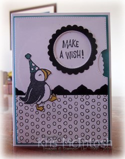 I also cut the circle mechanism from Basic White card. I didn’t cut my window in the centre of the card front, and so I had to do a little playing to get the stamped greetings right. I stamped, Make a Wish from the Party Puffins stamp set, the candle image from the Party Puffins stamp set and the cake image from the Party Puffins stamp set into the “window” space using Memento Tuxedo Black ink. I coloured the images where necessary using Bermuda Bay and Dark Daffodil Delight Stampin Blends. I pierced a hole through the centre of the circle piece I cut from the card front and used a brad to attach it to the back of the mechanism. I added a dimensional to each side of the brad. I lined up the mechanism behind the card front and attached it to Bermuda Bay card.