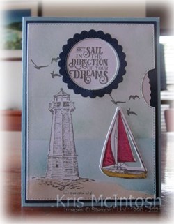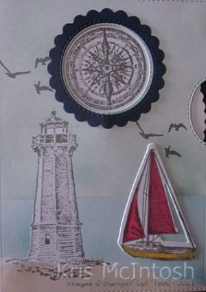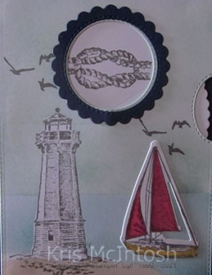 Today’s card is another that I made using the Give It A Whirl Dies. I cut Basic White card using the card front die and using the circle window at the same time. I stamped the lighthouse from the Sailing Home stamp set onto the lower left hand corner using Basic Gray ink. I used a post it note mask to cover the lighthouse and more post-it-notes to mask off all but a small portion across the bottom of the card front. I used a Blending Brush to add Crumb Cake ink.