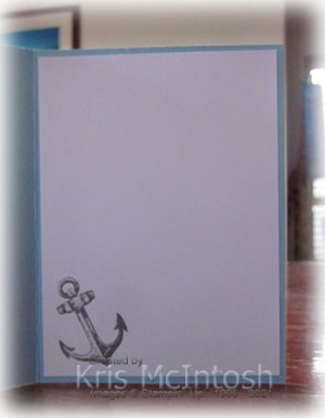 I cut the turning mechanism from Basic White card using the Give It A Whirl Die and stamped the compass, rope and greeting from the Sailing Home stamp set using Basic Gray ink so that they would show in the circle window. I attached the circle from the card front to the back of the turning mechanism and attached it to Night of Navy card using dimensionals. I attached the card front also using dimensionals in the corners only. The whole panel is attached to scored and folded Balmy Blue card. I cut the frame for the circle window from Night of Navy card using the Give It a Whirl Die. To decorate the inside of the card I stamped the anchor image from the Sailing Home stamp set onto the lower left hand corner of Basic White card using Basic Gray ink.