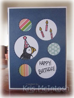 Yesterday in my Facebook Live, I shared some cards created using the Picture This Dies. These dies from the Annual Catalogue are stand alone dies, they do not co-ordinate specifically with any stamp set in the catalogue but can be used in any way you wish. For today’s card, I cut a card front sized piece of Misty Moonlight using the circle card front die. At the same time I cut a card front sized piece of scrap paper using the same dies. I used the template to stamp the Puffin and candle images from the Party Puffin stamp set onto a scored and folded Thick Basic White card front.