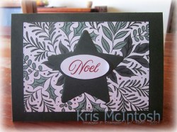 I cut the image using one of the Stitched Rectangle Dies and attached it to a scored and folded Evening Evergreen card base. I cut Evening Evergreen card using the large star image from the Christmas Trimmings Dies and attached it to the centre of the stamped panel. I stamped “Noel” from the Tidings & Trimmings stamp set onto Basic White card using Cherry Cobbler ink. I punched the greeting using the Double Oval Punch and attached it to the centre of the die cut star using dimensionals.