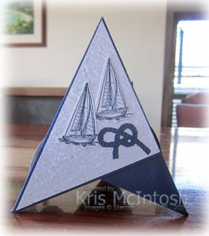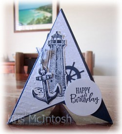 I stamped “happy birthday” from the Peaceful Moments stamp set onto Basic White card using Night of Navy ink and cut it out using the Layering Circle Dies. I attached it using dimensionals so that it would hold the pyramid card in position. To decorate the second panel, I stamped the compass and large sailing ship images from the Sailing Home stamp set onto Basic White card using Night of Navy ink. I cut out the sailing ship using the co-ordinating Smooth Sailing Die.