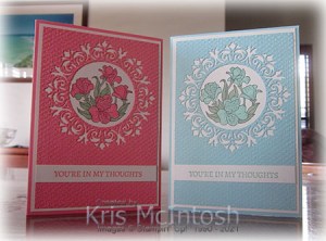 Today I created two versions of the same card for a couple of lovely ladies who have recently experienced a terrible loss. For the first card, I used one of the dies from the Encircled in Beauty Dies to cut Flirty Flamingo card. The Flirty Flamingo card is then embossed using the Tasteful Textile 3D Embossing Folder. I placed the panel temporarily over a piece of Very Vanilla card and stamped the image from the Encircled in Friendship stamp set into the circle using Memento Tuxedo Black ink. I removed the embossed panel and coloured the image using Dark Flirty Flamingo and Dark Mint Macaron Stampin’ Blends.