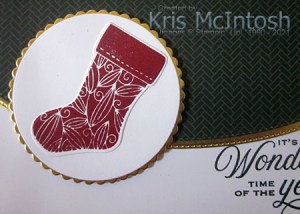 The circle panel is attached to the card front using dimensionals. I stamped the stocking image from the Tidings & Trimmings stamp set onto Basic White card using Cherry Cobbler ink and cut it out using the co-ordinating Christmas Trimmings Die. I attached the die cut to the centre of the Basic White circle. To decorate the inside of the card, I stamped the greeting from the Tidings & Trimmings stamp set onto Basic White card using Evening Evergreen ink. The stamped panel is attached inside the Cherry Cobbler card base.