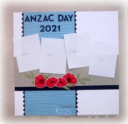 We were able to join our daughter and her family at the Dawn Service on Anzac Day at Ethan’s Cadet Base. Unfortunately the Cadet rules are that I cannot share any photos of Ethan wearing his uniform. So I have placed some copy paper to indicate where the photos will go. I started my page by embossing Balmy Blue card using the Bark 3D Embossing Folder. I cut Night of Navy card using one of the Basic Border Dies and attached the die cuts down each side of the embossed card before attaching the panel to a Basic White 12″ x 12″ page.