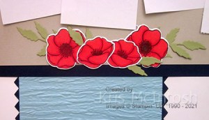 I attached a strip of Night of Navy behind one long edge of a wide strip of Crumb Cake card before attaching it to the page. I cut the title from Night of Navy card using the Playful Alphabet Dies. I stamped the large and small flower from the Painted Poppies stamp set onto Basic White card using Memento Tuxedo Black ink. I coloured the flowers using the Poppy Parade Stampin’ Blends and cut them out using the Painted Labels Dies. I cut Pear Pizzazz card using one of the Poppy Moments Dies to create the leaves. I layered the flowers and leaves together before attaching them to the page. I hope you like the layout and perhaps it will inspire you to create a page of your own.