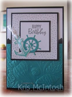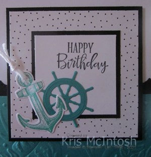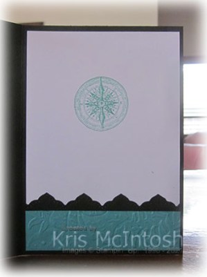 I cut Bermuda Bay card using the wheel die from the Smooth Sailing Dies and attached it onto the stamped panel below the greeting. I stamped the anchor image from the Sailing Home stamp set onto Basic White card using Bermuda Bay ink. I cut out the anchor using the co-ordinating Smooth Sailing Die. I threaded some White Twine from the Baker’s Twine Essentials Pack through the hole in the top of the anchor and tied a knot before attaching it to the card front. To decorate the inside of the card, I stamped the compass image from the Sailing Home stamp set onto Basic White card using Bermuda Bay ink. I embossed Bermuda Bay card using the Seashells 3D Embossing Folder before attaching the other half of the die cut from Basic Black card using the Basic Border Dies behind one long edge. The panel is attached to the bottom of the stamped Basic White card.
