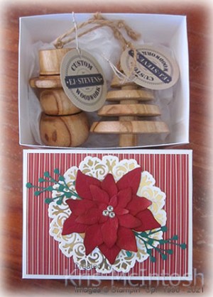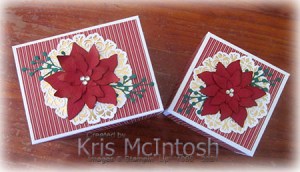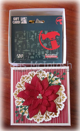My hubby loves Bunnings Gift Vouchers and wanted to steal this present back! To decorate the box lids I added panels of the Tidings of Christmas 6″ x 6″ Designer Series Paper. I punched two sides of the lids using the Double Oval Punch to give a finger grip to remove the lid. I cut Basic White card using one of the Encircled in Beauty Dies and attached it to Gold Foil card cut using the same dies before attaching the panel to the lid. I cut the flower petals from Cherry Cobbler card using the Poinsettia Dies.