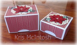 I added a slight sponging of Cherry Cobbler ink around the edges of the flowers before attaching them together. The flower is attached to the centre of the dies on the lid of the box with dimensionals underneath the outer part of the petals and glue dots in the centre to give it a little dimension. I cut Shaded Spruce card using another of the Poinsettia Dies, which I attached on either side of the flower. Lastly I added three Basic Rhinestones to the centre of the flower because you have to have bling.