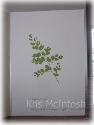I stamped the leaf image from the Positive Thoughts stamp set over the rectangle using Pear Pizzazz ink. I stamped the greeting from the Positive Thoughts stamp set also using Pear Pizzazz ink. The stamped panel is attached to Pear Pizzazz card and then scored and folded Thick Very Vanilla card. To decorate the inside of the card, I stamped the same leaf image from the Positive Thoughts stamp set using Pear Pizzazz ink. A really simple card but I think quite pretty, what about you?