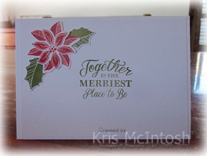 I added three Red Rhinestones to the centre of the flower – you really need to have some bling! To decorate the inside of the card, I stamped the greeting from the Merriest Moments stamp set onto Basic White card using Old Olive ink. I stamped the flowers and two leaves as before and cut them out using the co-ordinating dies. I layered the flowers and leaves onto the top left hand corner of the stamped Basic White card. Lastly I stamped the small dotted image onto the centre of the flower using Real Red ink before attaching the panel to the inside of the card.