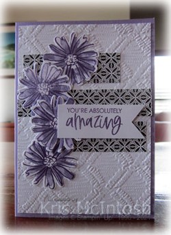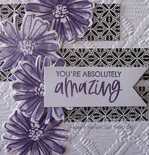 I attached the other one to the right and below the Designer Series Paper strip. I stamped the outline single flower image from the Colour & Contour stamp set onto Basic White card four times using Gorgeous Grape ink. I stamped the solid single flower over the outline image using Highland Heather ink.