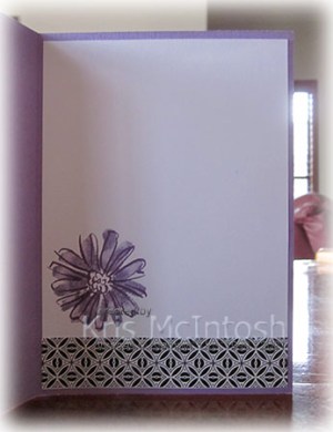 I cut out the images using the co-ordinating Scalloped Contour Die. I attached all of the flowers to the left hand side of the card front, using dimensionals for the third flower. I stamped the greeting from the Colour & Contour stamp set onto Basic White card using Gorgeous Grape ink. I cut a “v” in the right hand edge before attaching the greeting to the card front using dimensionals. To decorate the inside of the card, I stamped the outline single flower image from the Colour & Contour stamp set onto the lower left hand corner of Basic White card using Gorgeous Grape. I stamped the fill image over the top using Highland Heather ink. I attached a narrow strip of the same pattern of Pattern Party Designer Series paper across the bottom of the card.