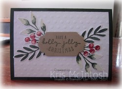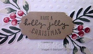 I stamped the berries using Evening Evergreen and Cherry Cobbler ink. All of the images were cut out using the co-ordinating Seasonal Labels Dies. I stamped the greeting from the Christmas to Remember stamp set onto Crumb Cake card using Evening Evergreen ink and cut it out using one of the tags in the Seasonal Labels Dies. I attached the leaves to the card front and the greeting over the top using dimensionals.