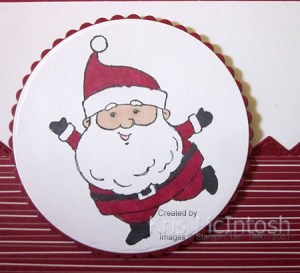 I stamped the greeting from the Holly Jolly Wishes stamp set onto the top right hand corner using Cherry Cobbler ink. I stamped the Santa image from the Be Jolly stamp set onto Basic White card using Memento Tuxedo Black ink. I cut out the Santa using the Layering Circle Dies before colouring the image using the Dark Cherry Cobbler, Dark Basic Black, Light Flirty Flamingo and Ivory Stampin’ Blends. I attached the image to a Cherry Cobbler scalloped circle cut using the Layering Circle Dies. The whole panel is attached to the card front using dimensionals.