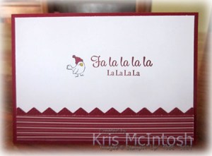 To decorate the inside of the card, I stamped the greeting from the Holly Jolly Wishes stamp set using Cherry Cobbler ink. I stamped the bird image from the Be Jolly stamp set beside the greeting using Memento Tuxedo Black ink. I coloured the birds hat using the Dark Cherry Cobbler Stampin’ Blend and his beak using the Dark Daffodil Delight Stampin’ Blend. I attached the second half of the die cut behind one long edge of a strip of the same Tidings of Christmas Designer Series Paper before attaching it across the bottom of the stamped Basic White panel.