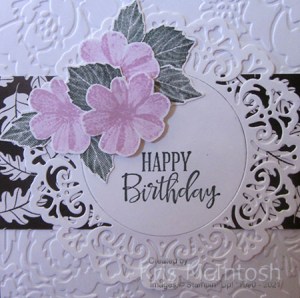 Yesterday in my Facebook Live, I shared some cards using the Delicate Dahlia stamp set which you can earn for FREE with a qualifying order during Sale-a-bration. For today’s card I began by embossing Basic White card using the Pretty Flowers Embossing Folder. I attached a strip of Pattern Party Designer Series Paper across the embossed card before attaching to scored and folded Evening Evergreen card. I cut Basic White card using one of the Encircled in Beauty Dies.